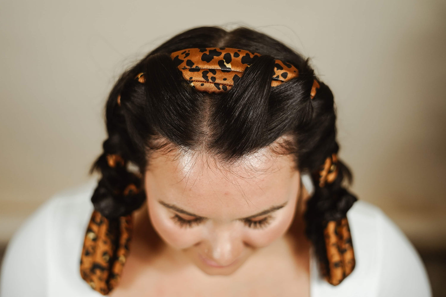 -After splitting your hair into two even sections, lay the Georgie on top of your head, making sure it's even on both sides. Make sure to lay it more towards the front of your head to help prevent it slipping back at night.